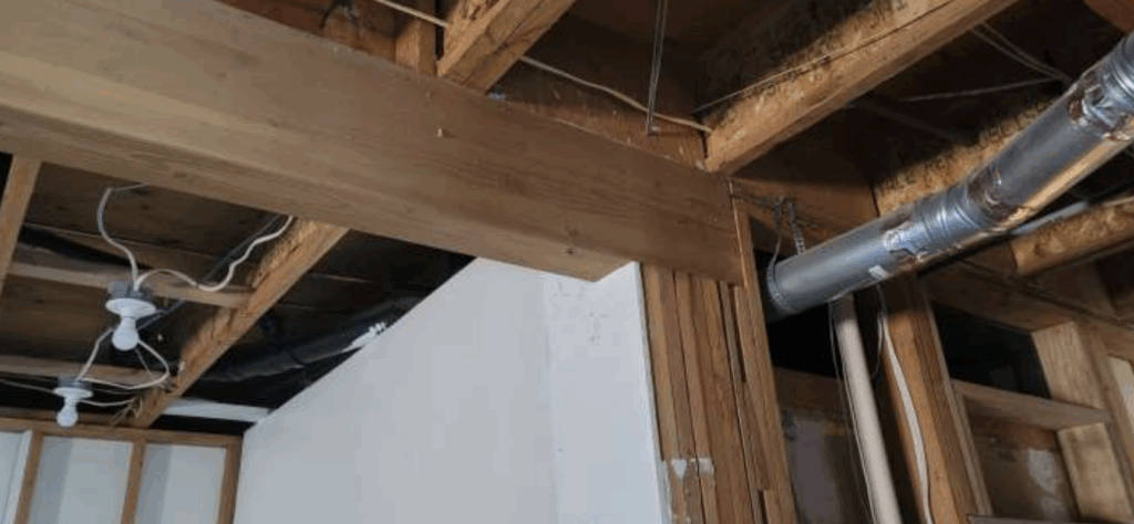 In the basement, a large 4×18 beam appears sound, but a smaller nearby 4×9 beam spanning about 21 feet shows signs of overstress and failure. With a tributary width of roughly 10 feet, it is undersized for its load. We recommend replacing it with either two 5-1/2×14 glulam beams or a W8x31 steel beam. The load must be supported temporarily during installation of the beam due to its weight.