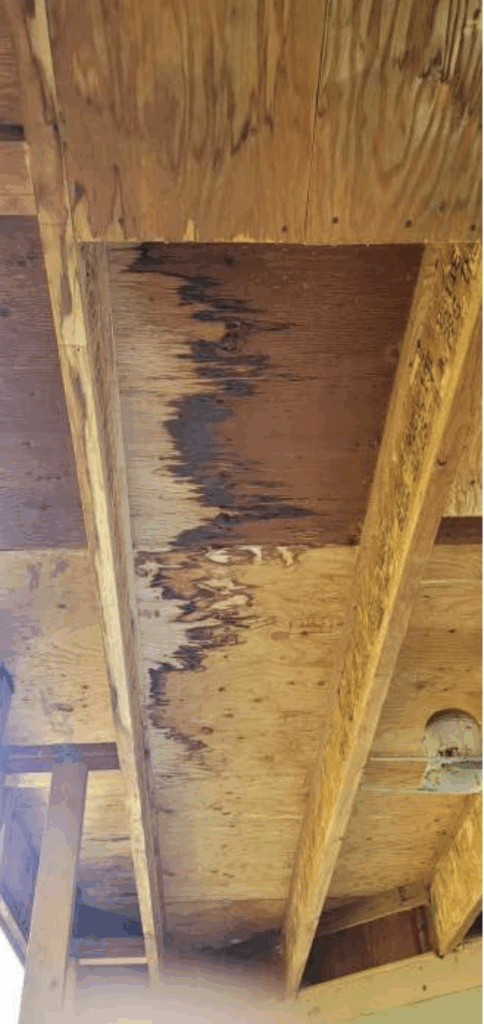 The ridge beam above the garage, about 27 feet long, shows both water damage and overstress. Because the garage may be removed in the future, we suggested a temporary fix using a 6×6 post beneath the ridge. This post would be supported to the soil with another 6×6 post and an 18-inch by 30-inch footing.
