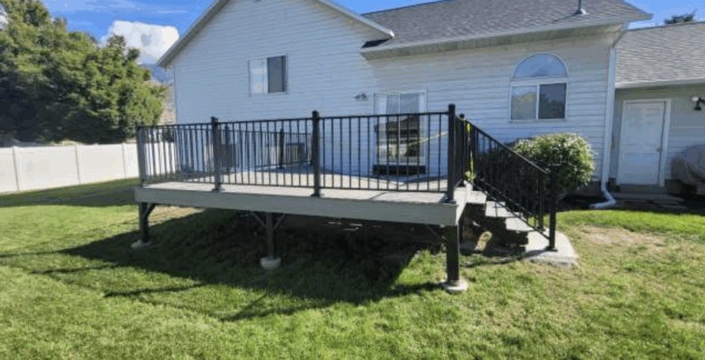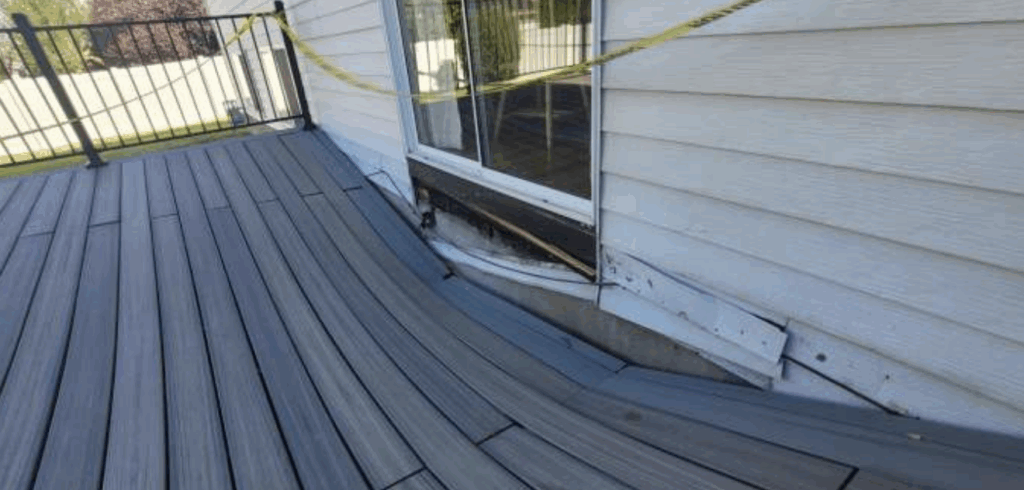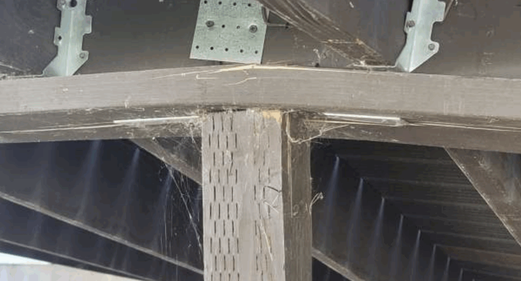 At a home in Orem, Utah, a recently built deck has shown clear signs of failure due to poor construction. The deck measures roughly 16 feet wide by 18 feet deep and was framed entirely with 2×8 lumber; including the joists, rim beam, and ledger. Eight columns support the structure, but the critical flaw lies at the house connection. Instead of a proper ledger board, the contractor installed a 2×8 with only a few inches of bearing, leaving the middle section completely unsupported.