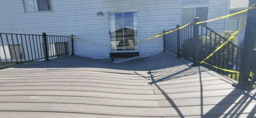 When the deck began to fail, the contractor blamed heavy loads. In truth, the only items placed on it were standard barbecue equipment which can be considered negligible in weight from a structural standpoint. The failed area sits directly outside the sliding door, showing that the issue stems from poor attachment rather than overloading.  People will try to blame a failure on many different reasons, however, an expert eye is always needed when diagnosing a structural failure.