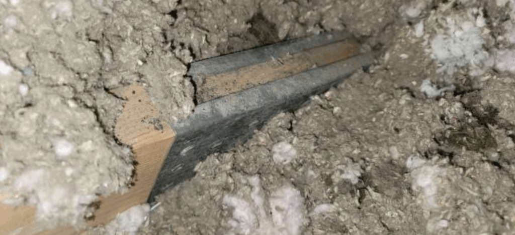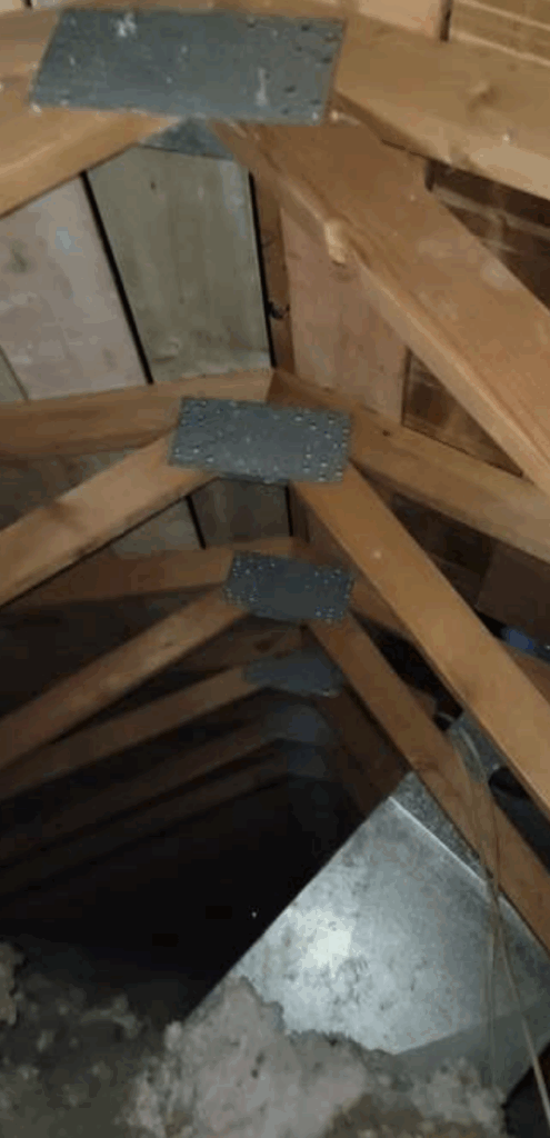 During inspection, we noted that a wall between the living and dining rooms appears to have been removed. The 2×4 rafters with steel plates still span about 27 feet, which is typical for when this home was built, and no roof framing members were found to bear on the removed wall.