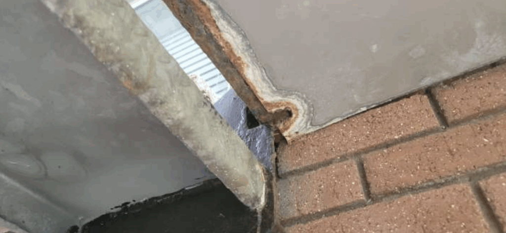 The underlying issue appears to be inadequate drainage. Stormwater currently collects near the southwest corner of the south building and discharges into a blind sump of unknown capacity. This design likely allows water to saturate and weaken the bearing soil, undermining the footing and causing the observed rotation. The heavy masonry exterior amplifies the effect, as even minor soil loss can produce visible cracking and movement.