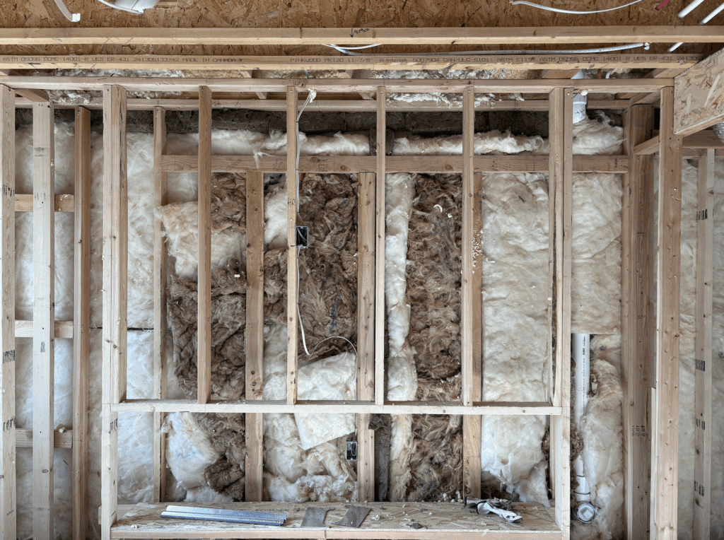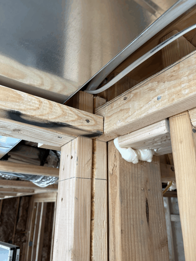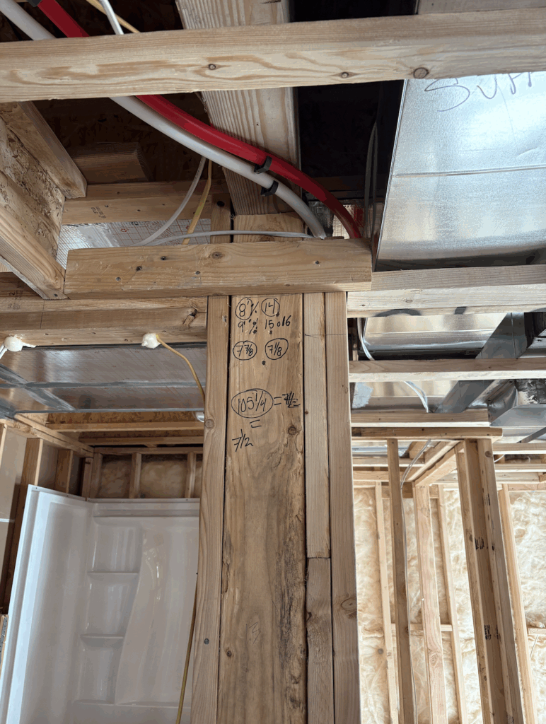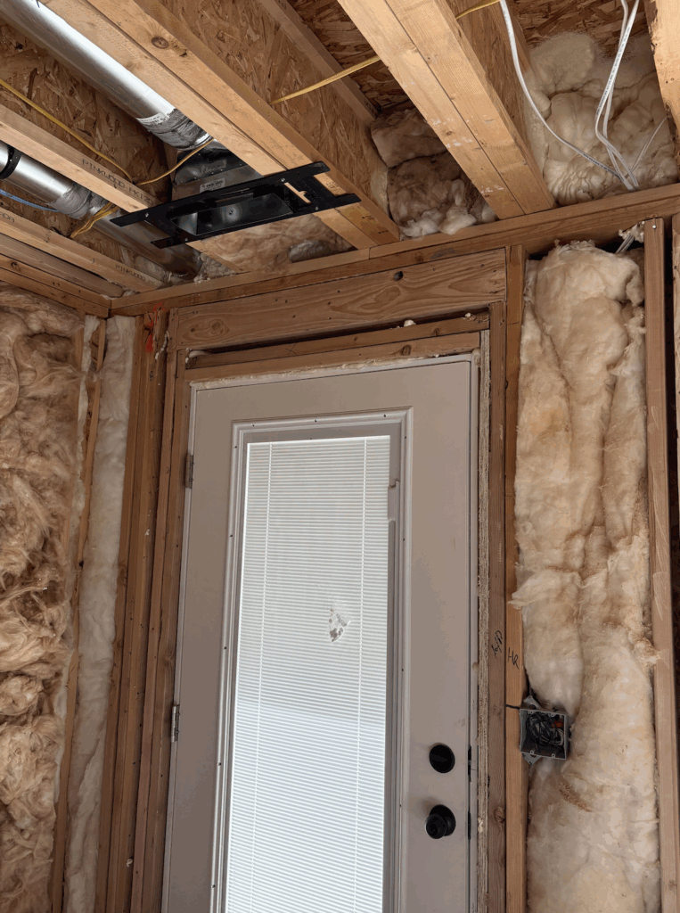 The door is the next element to be inspected for structural deficiencies. As seen below, the span of the door is greatly less than the span of the five-foot-long windows on the same load-bearing wall. The door header is also seen to include three 2x4s resting on a single vertical 2×4 on each of its sides. If the window was cutting code close, then this door header should easily meet the requirements to properly support what’s above. This can also be verified with proper calculations.